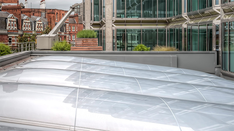印刷的三層ETFE 覆層具有高絕緣性能,覆蓋中庭,為建筑的碳足跡做出了積極貢獻(xiàn)。ETFE 系統(tǒng)允許進(jìn)入建筑物的高水平光傳輸,同時(shí)最大限度地減少熱量增加。這允許自然光進(jìn)入建筑物并減少人工照明需求,從而最大限度地減少能源使用。